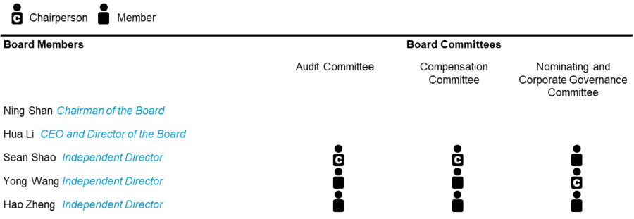 Mr. Sean Shao serves as an independent director and chairman of the audit committee of UTStarcom Holdings Corp. since October 2012 and the chairman of the compensation committee of UTStarcom Holdings Corp. since September 2019. He also serves as an independent director and chairman of the audit committee of 21Vianet Group, Inc. since August 2015. Mr. Shao took the role of chief financial officer and a board member of Trina Solar Limited from 2006 to 2008 and from 2015 to 2017, respectively. Mr. Shao was an independent director and chairman of the audit committee of Luckin Coffee Inc. from May 2019 until July 2020 and was re-appointed as an independent director of Luckin Coffee Inc. in September 2020. He was also the chairman of a special committee of the board which investigated accounting improprieties at Luckin Coffee Inc during 2020. In addition, Mr. Shao served as chief financial officer of ChinaEdu Corporation and Watchdata Technologies Ltd from 2004 to 2006. Prior to that, Mr. Shao worked at Deloitte Touche Tohmatsu CPA Ltd. for approximately a decade. Mr. Shao received his master’s degree in healthcare administration from the University of California at Los Angeles in 1988 and his bachelor’s degree in arts from East China Normal University in 1982. Mr. Shao is a member of the American Institute of Certified Public Accountants.