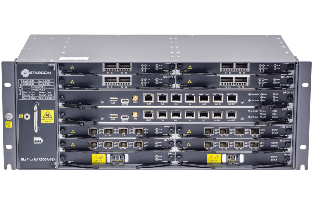 The SkyFlux UAR500A-08X is a modular 4RU chassis-based access/aggregation platform offering 8 service slots and 1+1 redundancy for major components including a switching fabric/controller and a power supply. The product provides 800Gbps switching capacity and a variety of interfaces including 1GE/10GE/25GE/50GE/100GE, and 50GE/100GE FlexE NNI.