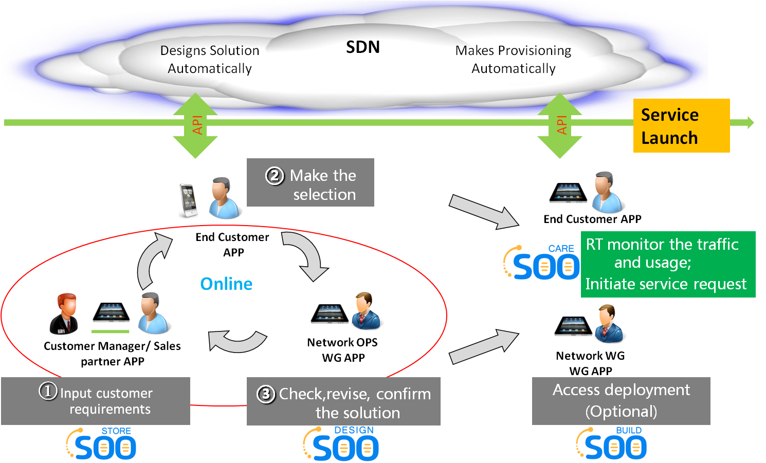 A set of native SOO applications designed to help carriers to optimize and automate services planning and provisioning and network operation. The basic set of SOO applications can be easily extended through the use of open Northbound APIs with native and 3rd party applications designed to accommodate specific operator’s requirements and business vision and meet customer’s needs and expectations through interactive customer-specific applications.