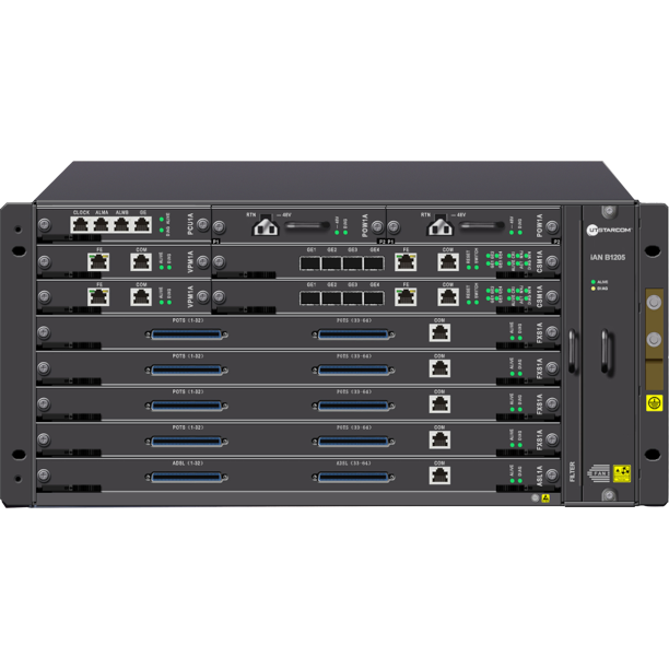 The B1205 supports a range of technologies such as POTS, ADSL/ADSL2/ADSL2+ which allows service providers to serve highly interactive and bandwidth intensive applications. B1205 acts as a traditional TDM based DLC, IPDSLAM, Media Gateway platform integrated into a single device and supports seamless migration from V5/AN to VoIP/AG and IMS Access.