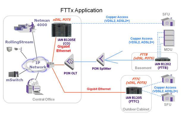 MSAN B1200 product line includes high (iAN B1205E), medium (iAN B1205 ) and low (iAN B1202) capacity devices that offer the benefit of converged access with an integrated TDM migration, POTS termination, DSL, Media Gateway and Ethernet/ xPON uplinks on the same platform.