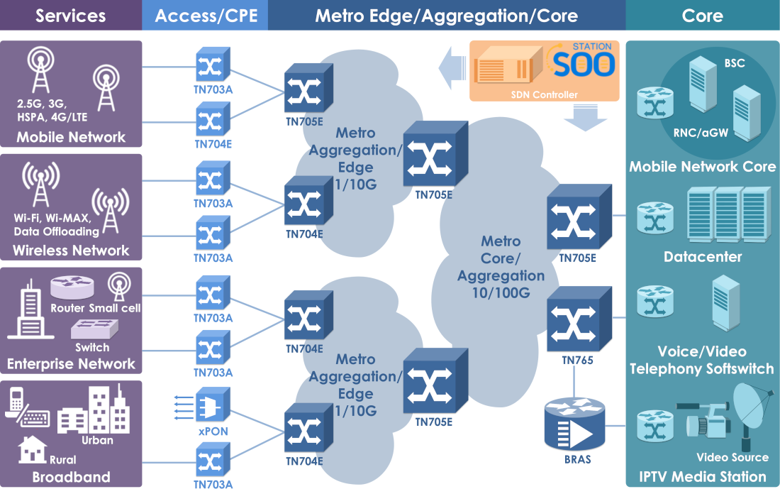 A highly scalable, agile and intelligent metro transport network based on the next generation HW and SW architecture of PTN. The product line offers support of up to 100GE interfaces, SDN-based automation features and advanced services, as well as a broad range of carrier-class features including network-wide time/clock synchronization, carrier class sub 50ms recovery resiliency, guaranteed QoS and SLA enforcement, end-to-end multi-layer OAM. The product line includes a complete line of network elements from access and edge to metro core high-performance devices.